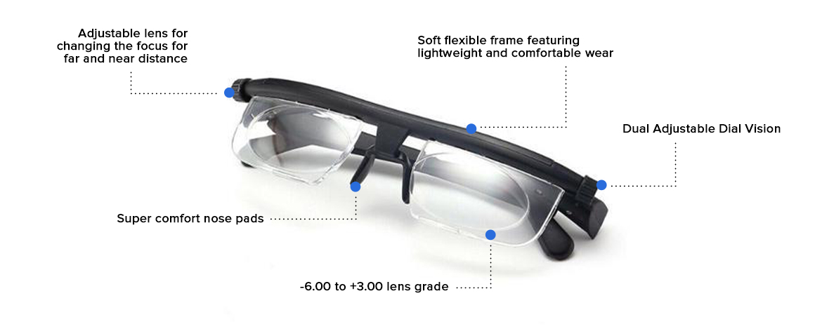 The Flex Vision Adjustable Glasses has a dial on the side of the glasses so you can adjust to your needs depending if you want to see what is in the distance or what is near you.